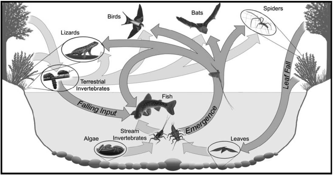 Ett ekosystem är komplext, där djur, växter och nedbrytare lever inom ett område och samverkar med omgivande miljö. Alla organismer i ett ekosystem ingår i en näringsväv som är sammansatt av flertal näringskedjor med producenter i botten och toppkonsumenter i högst upp i väven. Genom att studera en näringsväv kan man visa på hur olika ämnen (exempelvis näringsämnen och gifter) sprids och omvandlas i ekosystemet. I gränszonen mellan land och vatten koppas de olika miljöerna samman bland annat genom att organismerna ingår i näringsvävar som kan nyttja energi och näring från både land- och vatten miljön.